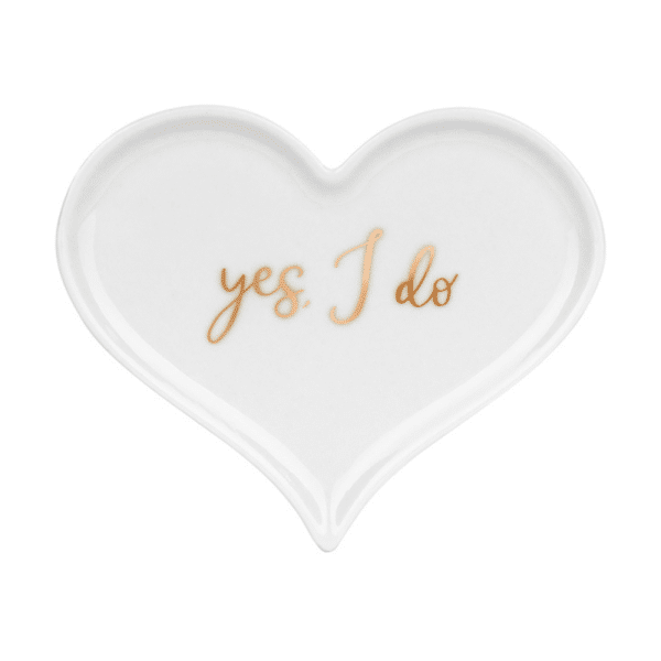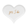 Cette assiette porte-alliances en porcelaine blanche en forme de cœur est ornée de l’inscription dorée « Yes, I do », symbole fort de l’engagement et de l’amour. Élégante et intemporelle, elle accompagne parfaitement la cérémonie de mariage en mettant en valeur les alliances au moment clé de l’échange. Son format compact 13,3 x 10,8 cm la rend facile à manipuler par l’enfant d’honneur ou le maître de cérémonie.